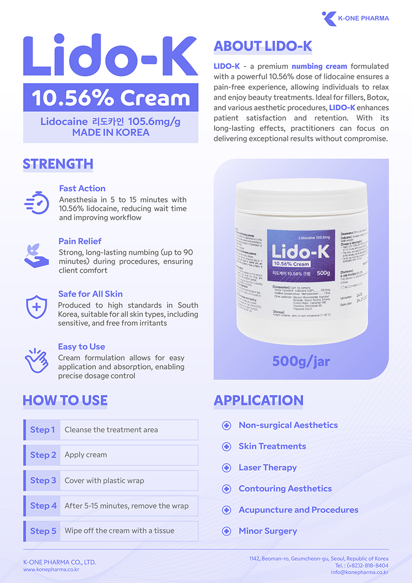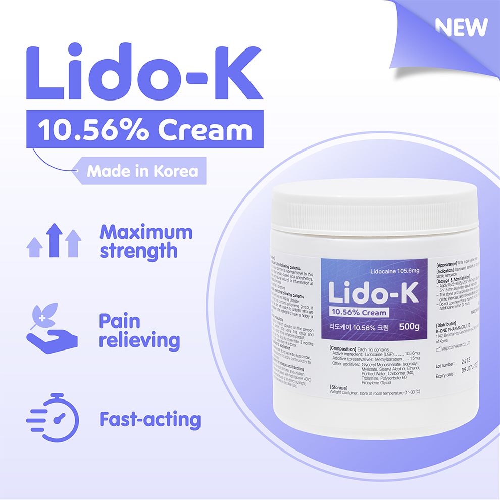 Lido-K 10.56% Cream is a professional-grade numbing cream designed to deliver fast and effective topical anesthesia. With 105.6 mg/g of lidocaine, this formulation provides a reliable solution for pain management during a variety of aesthetic and clinical procedures.